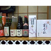売れ筋梅酒あれこれ 右側より 萬寿鏡/甕香梅・明利酒造/百年梅酒(第二回天満天神梅酒大会優勝)・梅乃宿の梅酒・梅乃宿/あらごし梅酒・佐多宗二商店/角玉梅酒(ANAオンメニュー商品)・山縣本店/梅のかほり