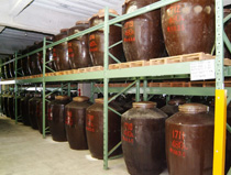 『その後、こだわりの焼酎を目指し平成9年3月より甕による長期貯蔵・熟成を初めました。現在(平成22年2月)では、容量500リットルのかめに芋・麦・米焼酎を約5,000個貯蔵しています。日本ではおそらくトップクラスの貯蔵量ではないかと自負しております。』