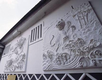 蔵の入り口には、地元の職人が造った漆喰のコテ絵、虎と龍が出迎えます。他には、小さなネズミの嫁入りのコテ絵。あと、うさぎ、きつねも・・・。独特の町人文化が花開いた日田のまちの遊びごころは、老松の商品造りにも受け継がれているのでしょうか。