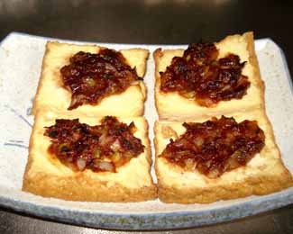 4.厚揚げにネギ味噌を塗りつけ。オーブントースターで全体が温まるまで約5分焼きます。