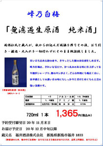 峰乃白梅の創業は、寛永16年(1636)その年から福井酒造によって醸した日本酒を越後三根山藩主に献上したという記録があります。峰は、品質面で山頂を目指し。白梅のようなきれいな日本酒造りをしたいとの願いが 「峰乃白梅」の酒名に込められています。 自然・人・米の三拍子そろった上に厳選したモノだけで造り上げる峰乃白梅。越の三梅の一つに上げられる「峰乃白梅」。 新潟の有名酒蔵の一つです。近所の酒屋のお兄さんから教えて頂いたのが「峰乃白梅 無濾過純米原酒」でした。説明を聞いてみると来月の12月中旬頃発売予約の限定商品でした。特徴は、複雑な風味が楽しい無濾過で瓶詰めした純米原酒の生酒です。新潟杜氏と蔵人が、秋から仕込んだ新酒を搾りその後、おり引き・濾過・火入れを一切行わずにそのまま瓶詰されています。(そのままの、すっぴん状態です)原酒は、アルコールドが高いための呑べいご用達と思われがちのようですがこの峰乃白梅 純米無濾過原酒は、新酒なので爽快さが立ち、飲みやすいようです。濾過していないので甘い立ち込める麹の香り、きりっとした酸の存在感をしめます。そしてきれいな旨口で、かつ丸みのある味に仕上がっており酸がシャープで、酸のキレがよく、どんな料理にも幅広く合い、食中酒としての濃い目の味にもしっかりと受けとめてもらえ芯の強い純米酒のようです。昨年もすぐに完売してしまった人気商品でさっそく予約しました。最後にこのお酒は、酵母が生きている生酒ですから日が経つにつれて味が微妙に変わっていくのをあえてその変化を飲み比べる奥深い楽しみ方もあるようで2本予約しました。