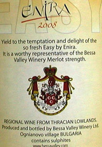 今回はワイン業界の話題をさらったイージー・バイ・エニーラの紹介をしましょう。ブルガリアのワインです。ブルガリアって何処?ブルガリアといって思い出すのはヨーグルト!!でも以外とワインの歴史は古いのです。トラキアと呼ばれていた三千年前、それ以前からワイン作りが行われていた世界最古のワイン産地の一つだそうです。ブルガリアのワインの特徴はブドウ栽培に恵まれた気候条件を有しています。高原地帯にある首都のソフィア付近と、中部山岳地帯を除いた丘陵地と平地でブドウ栽培が行われています。品種は古くからのものと、今世紀になってからの新しい品種の両方が栽培され、それぞれに特徴のあるワインを生み出しています。白ワインはフレッシュで軽く、飲み頃の早いものが主体です。赤ワインはコクのある力強いものが多くみられます。今では瓶詰めワインに限れば、フランスに次いで世界第二位の輸出量で国内での消費は少なく、生産量の90%が輸出されています。この話題のワインを手がけたのは、「ラ・モンドット」や「カノン・ラ・ガフリエール」で知られるナイペルグ伯爵です。驚くほどのコストパフォーマンスを引きだしました。メルロー100%、コンクリート・タンクに入れられ、発酵前の低温浸漬後に約10日間の醗酵、そして旧フレンチ・バリック(1年樽、2年樽、3年樽)にてMLF後、同バリックで8〜10ヶ月間の熟成を行います。ベッサ・ヴァレーで栽培されているメルローの品質と、畑仕事の質の高さが理解できる完熟した果実の心地よいアロマと口当たり。チャーミングなラズベリーやミント、心地よいオークの風味が広がり、なめらかなタンニンの舌触り。まさにトレビアンです。自信を持ってお勧めしますので、お試しあれ。